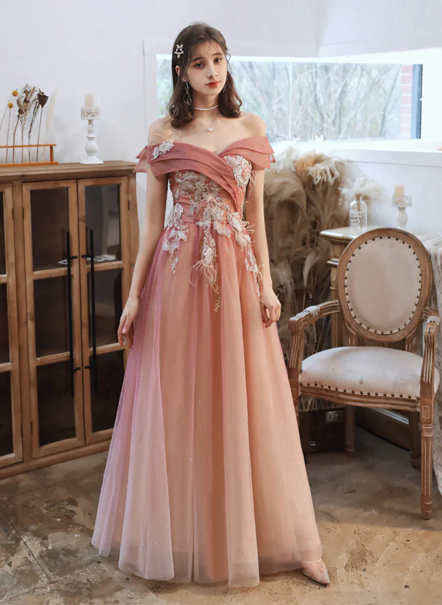 Gradient Pink Off Shoulder A-line with Flowers Prom Dress, Pink Long Formal Dress