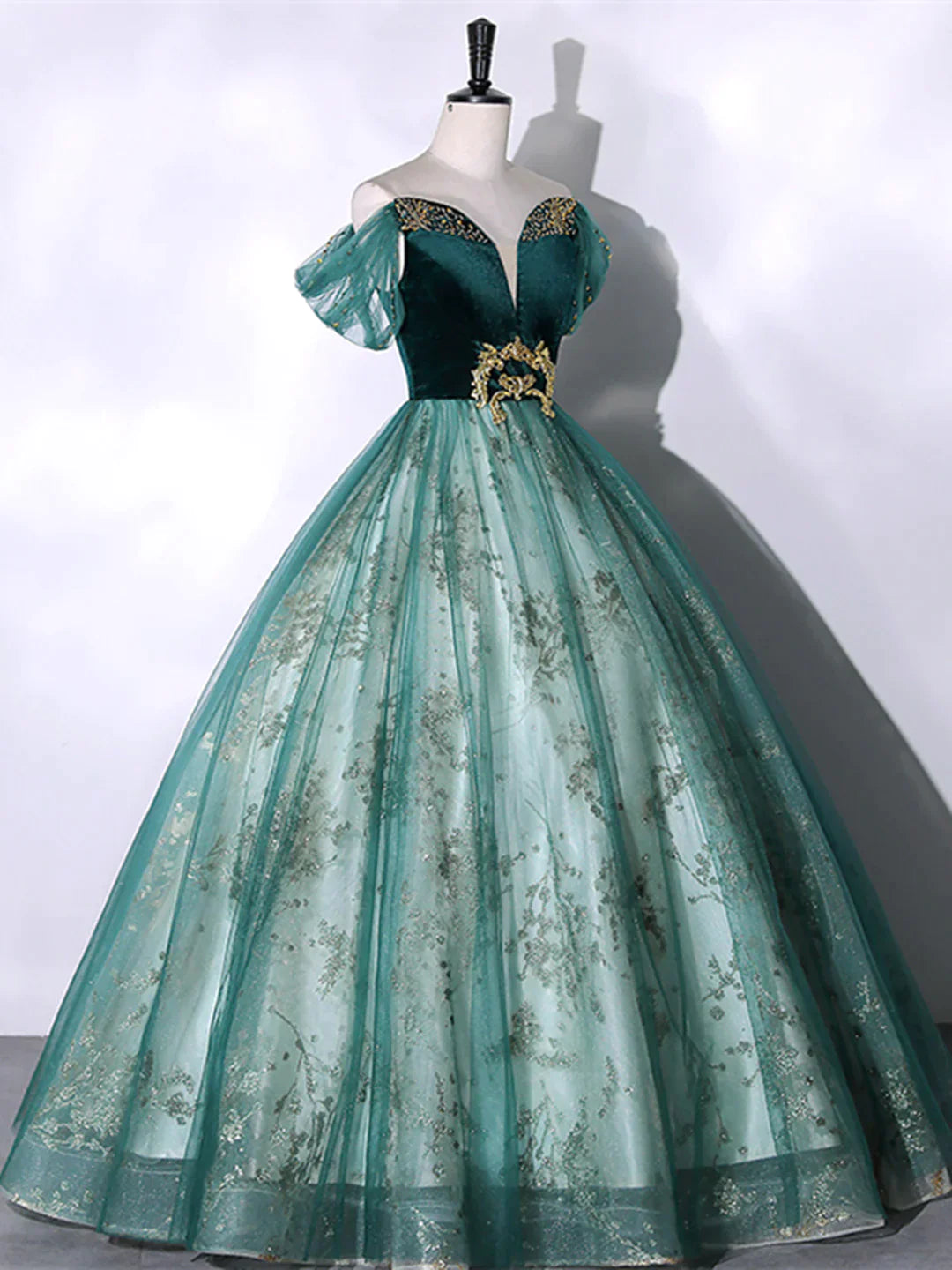 Green Ball Gown Tulle Beaded Off Shoulder Sweet 16 Dress, Green Evening Gown
