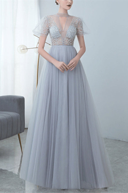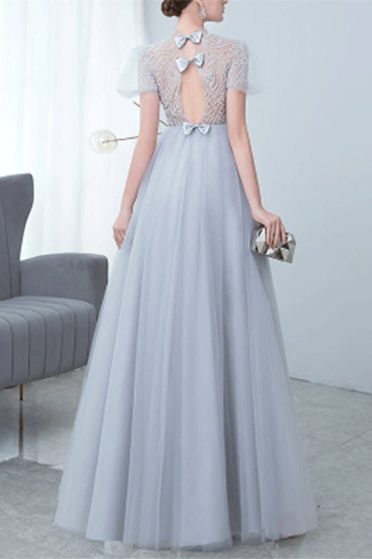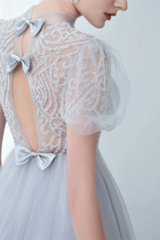Grey Tulle Evening Dress with Bowknot and High Collar Appliques