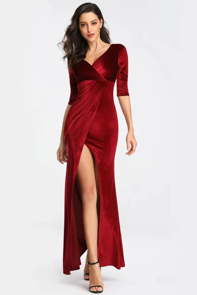 Half Sleeve Velvet Prom Dresses Long Split Evening Gowns