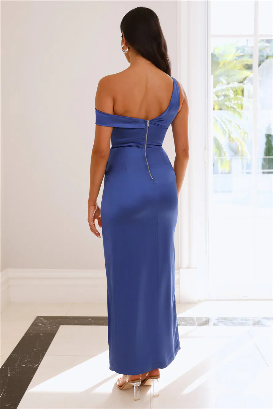 Jimiss asymmetrical neckline backless satin side slit long Prom dress