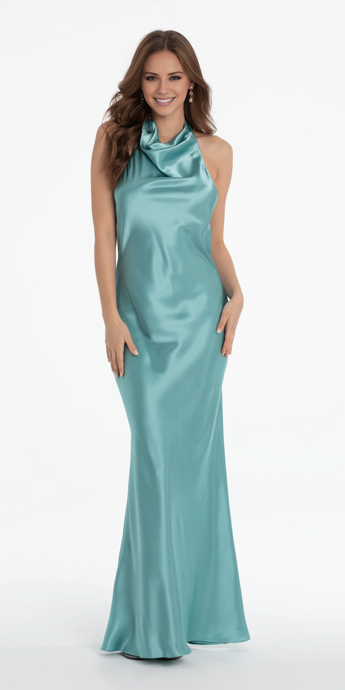 Jimiss halter neckline satin sleeveless off shoulder and floor length Prom dress