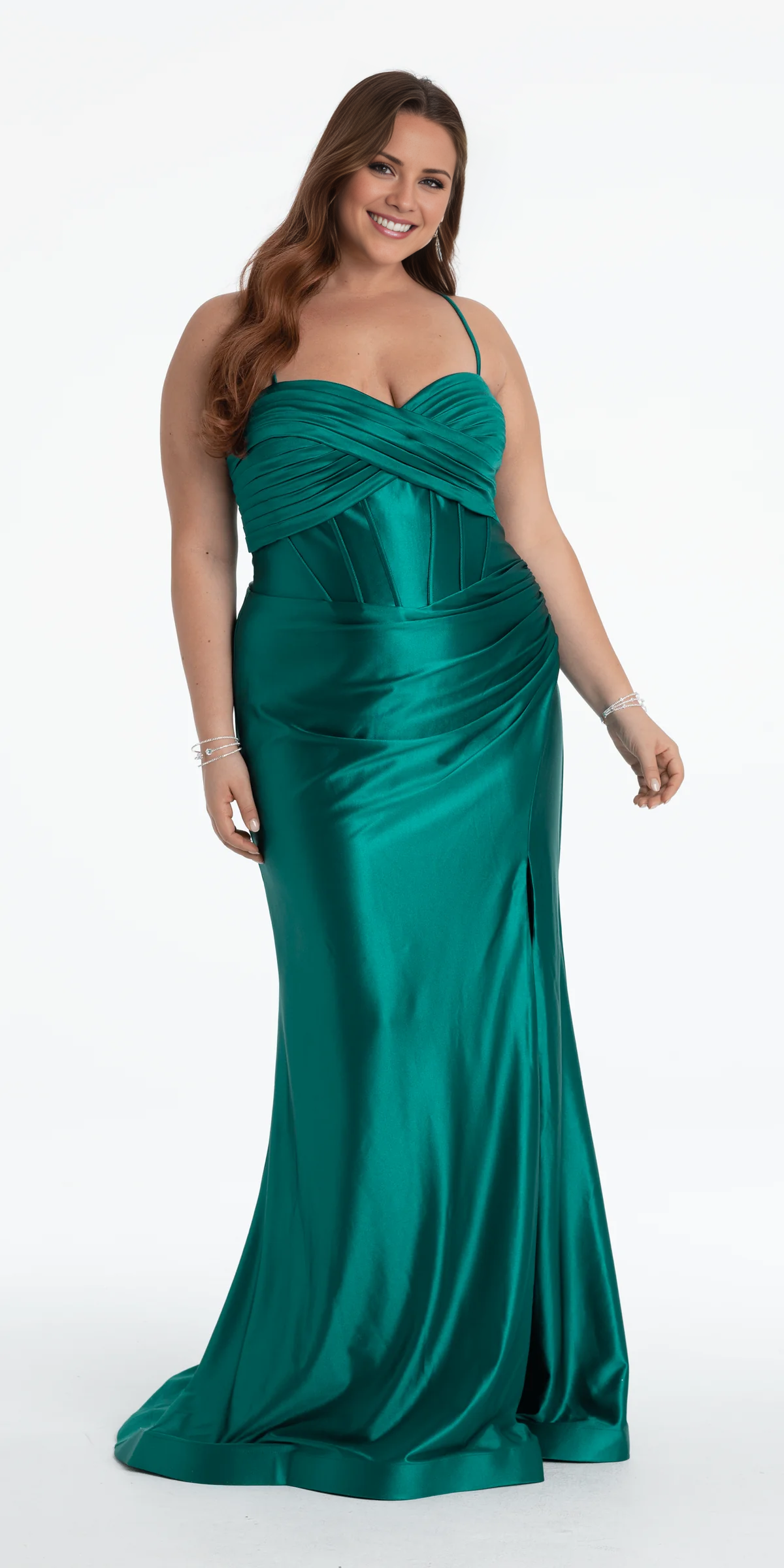 Jimiss off shoulder satin thin shoulder strap tight corset and floor length Prom dress