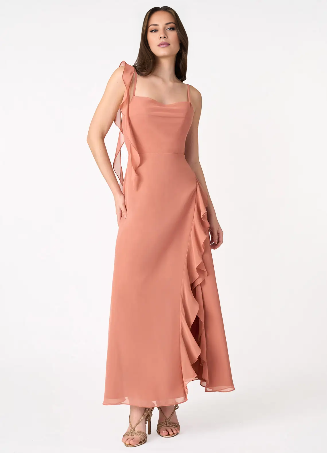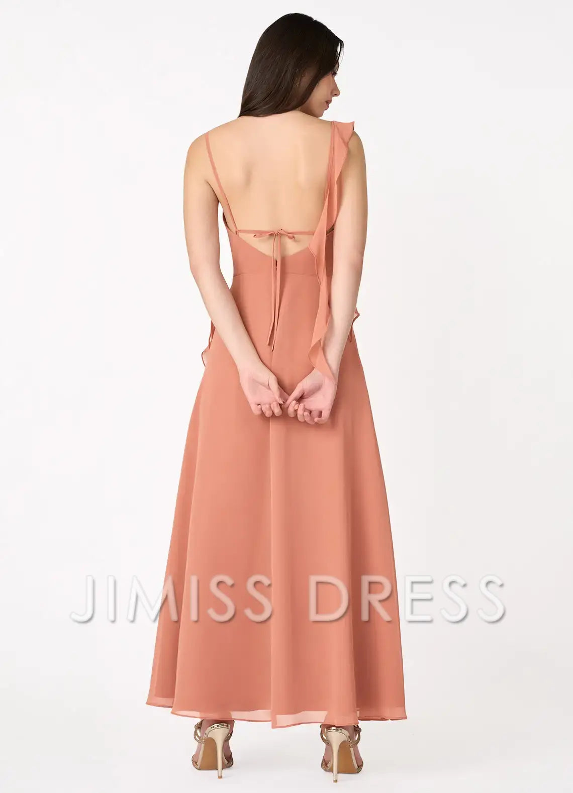 Jimiss slim shoulder chiffon asymmetrical ruffle edge side slit and floor length Prom dress