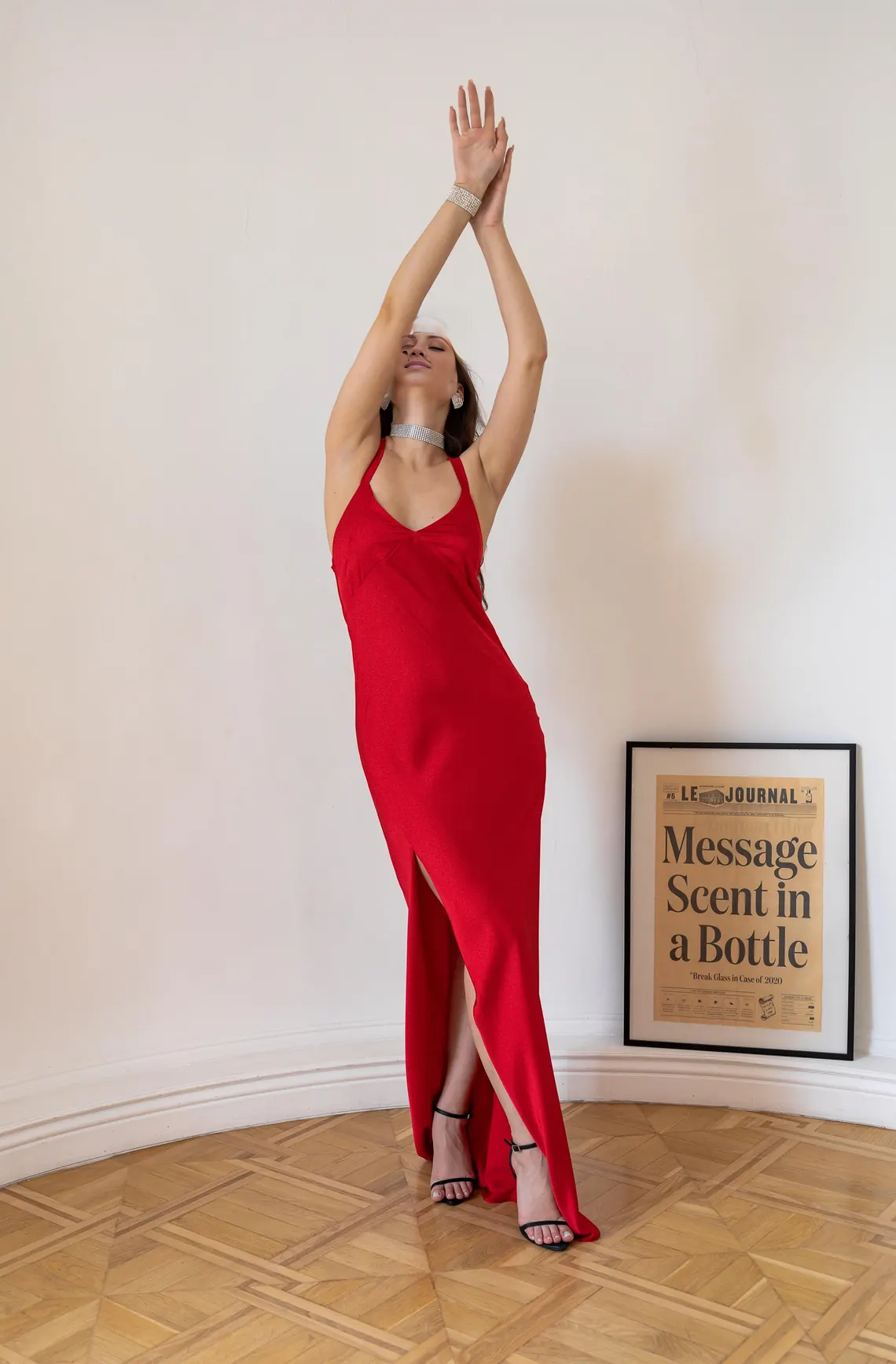 Jimiss slim shoulder strap V-neck side slit and floor length Prom dress