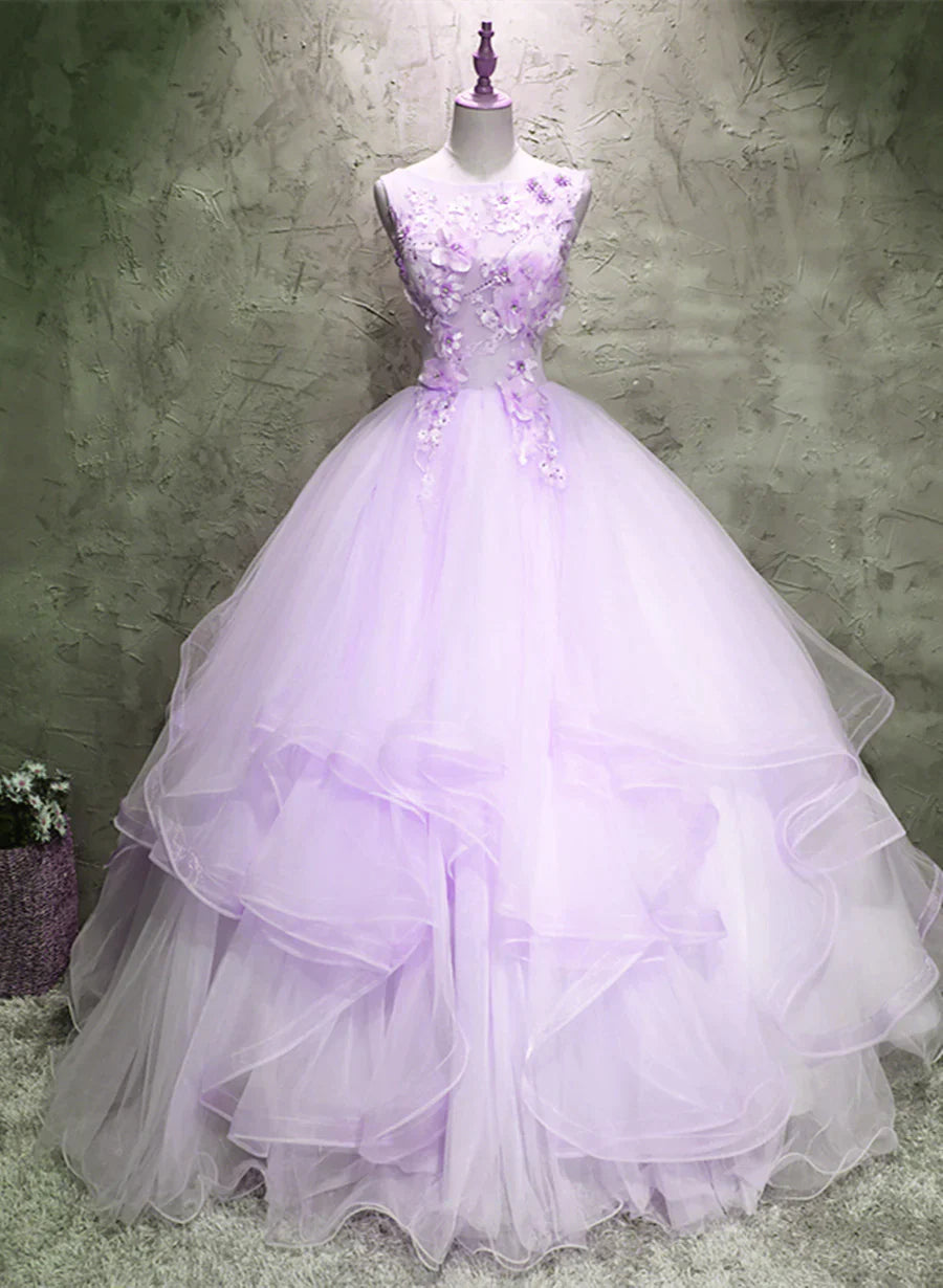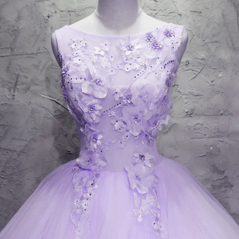 Lavender Tulle with Flowers Ball Gown Sweet 16 Dress, Lavender Long Formal Dress