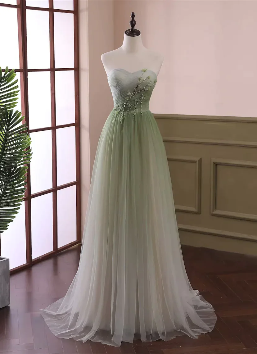 Light Green Gradient Tulle Long Formal Dress, Green Beaded Sweetheart Prom Dresses
