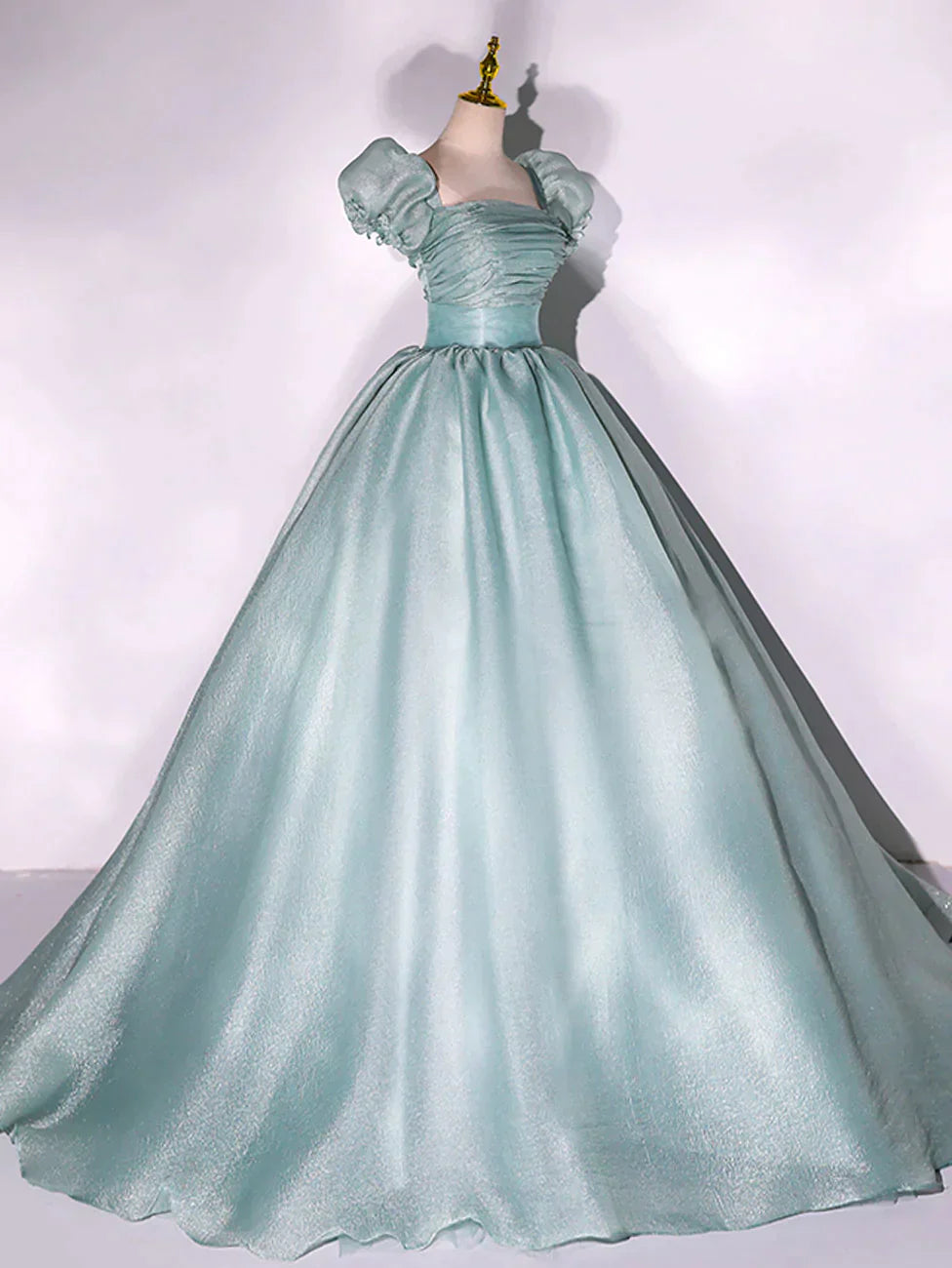 Light Green Short Sleeves Long Sweet 16 Dress, Green Scoop Prom Dress