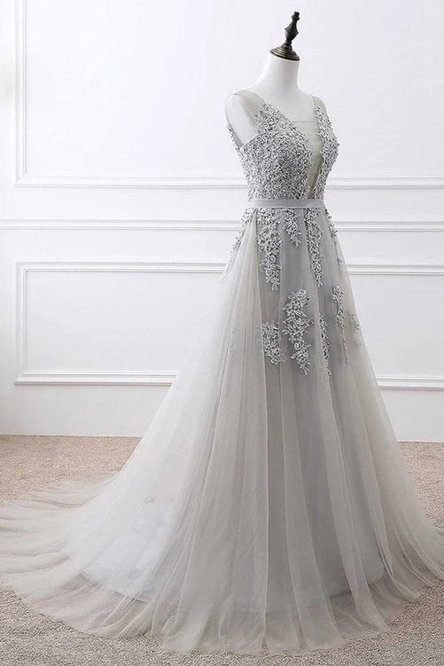 Light Grey Long Party Dress New Prom Dress A Line Sleeveless Royal Blue Evening Dress with Appliques