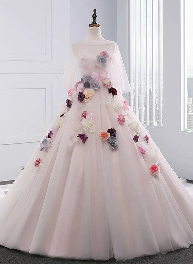 Light Pink Tulle Ball Gown Formal Dress with Flowers, Pink Sweet 16 Gown