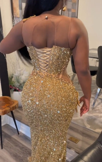 Long Mermaid Sequin Gold Sleeveless Lace-Up Prom Dresses