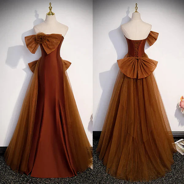 Mermaid Brown Tulle Satin Strapless Long Party Dress Formal Dress Prom Dress With Bow(s)