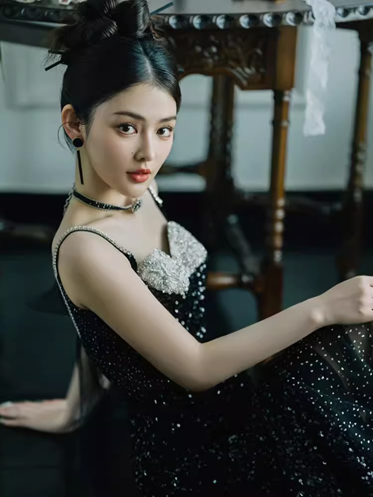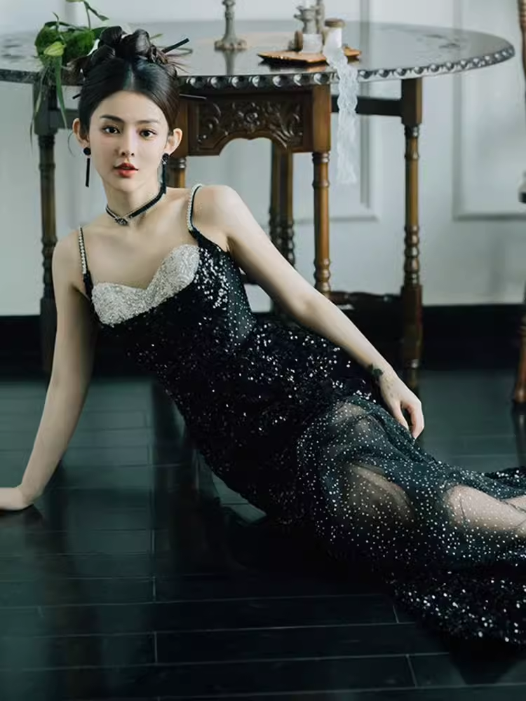 Mermaid Straps Long Black Sequin Slit Prom Dresses P1921