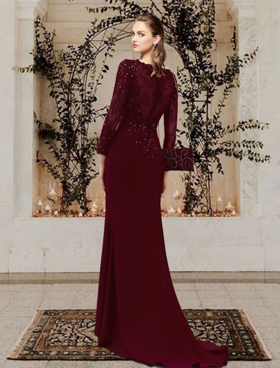 Mermaid / Trumpet Mother of the Bride Dress Elegant Jewel Neck Sweep / Brush Train Chiffon Lace Tulle Long Sleeve with Appliques
