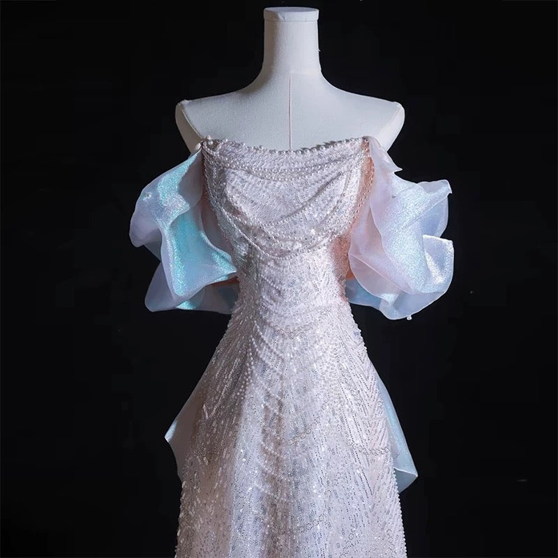Modest A line Off The Shoulder Pink Sequin Long Floor Length Pearls Prom Dresses P2404