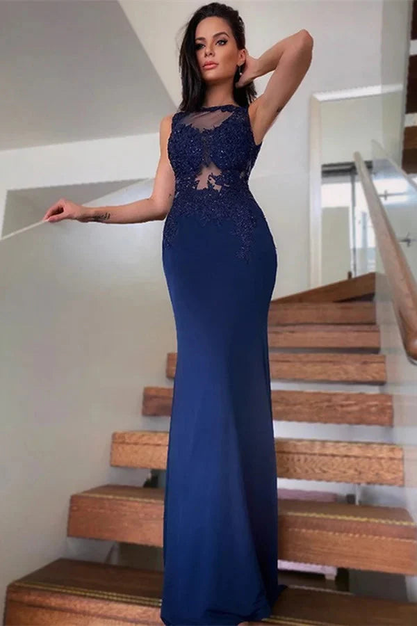 Navy Blue Lace Appliques Mermaid Evening Dress Sleeveless