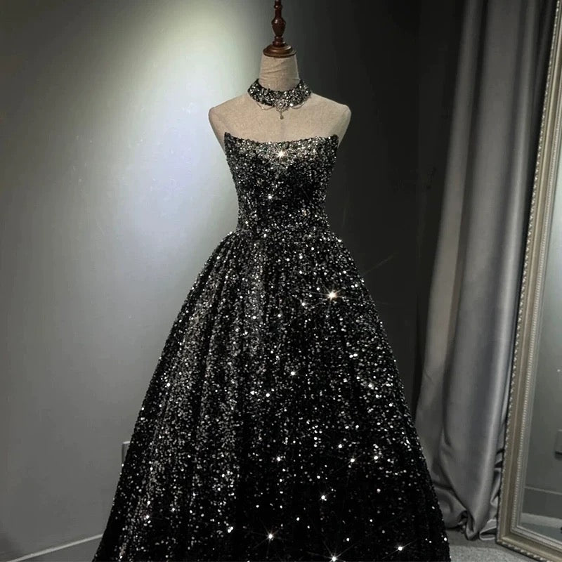 Pretty Ball Gown Strapless Black Sequin Prom Dresses Evening Dress P2463