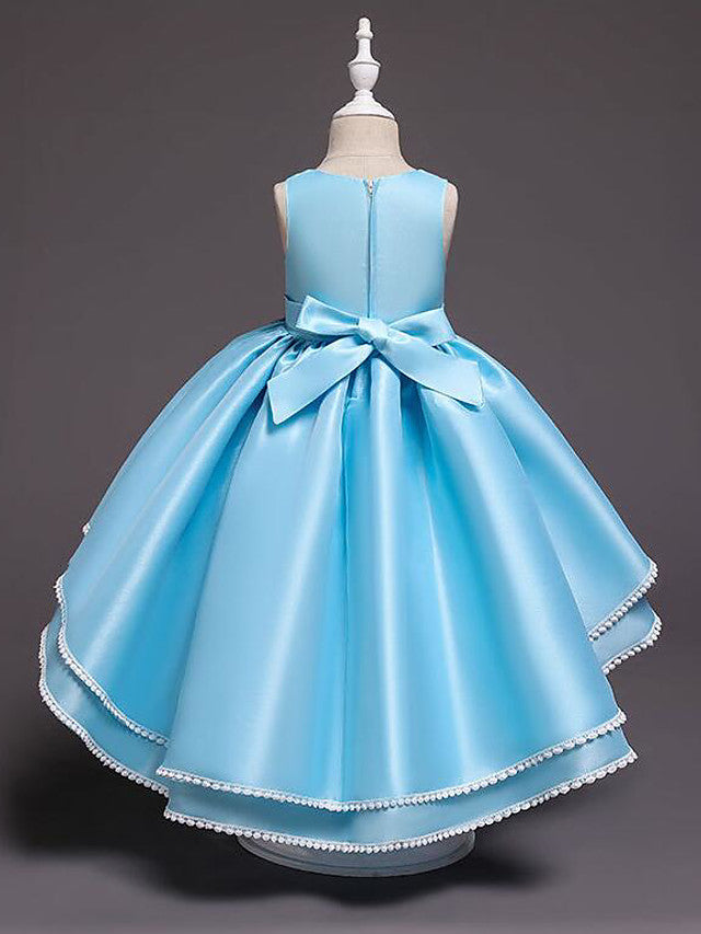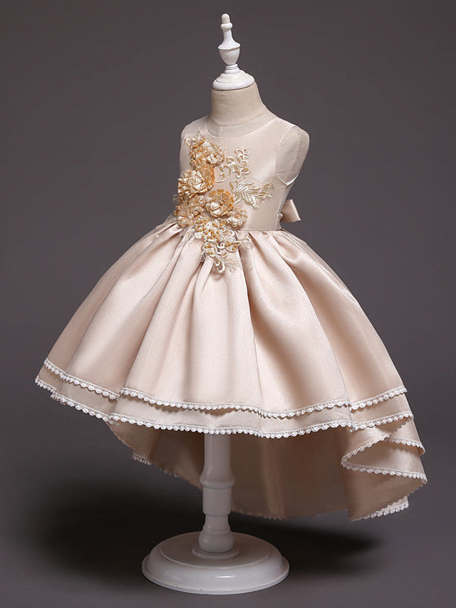 Satin Tulle Asymmetrical Flower Girl Dress with Lace Belt Appliques