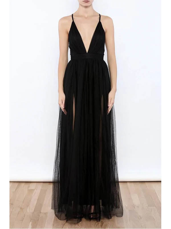 Sexy Black V-neck Side Slit Tulle Evening Gowns Prom Dresses, OL691