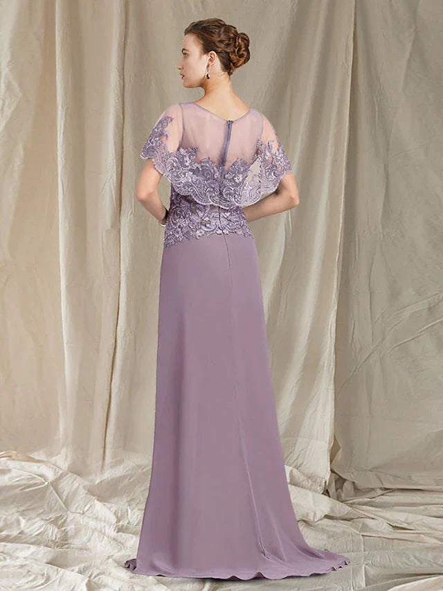 Sheath / Column Mother of the Bride Dress Elegant Jewel Neck Sweep / Brush Train Chiffon Lace Sleeveless with Ruffles Appliques