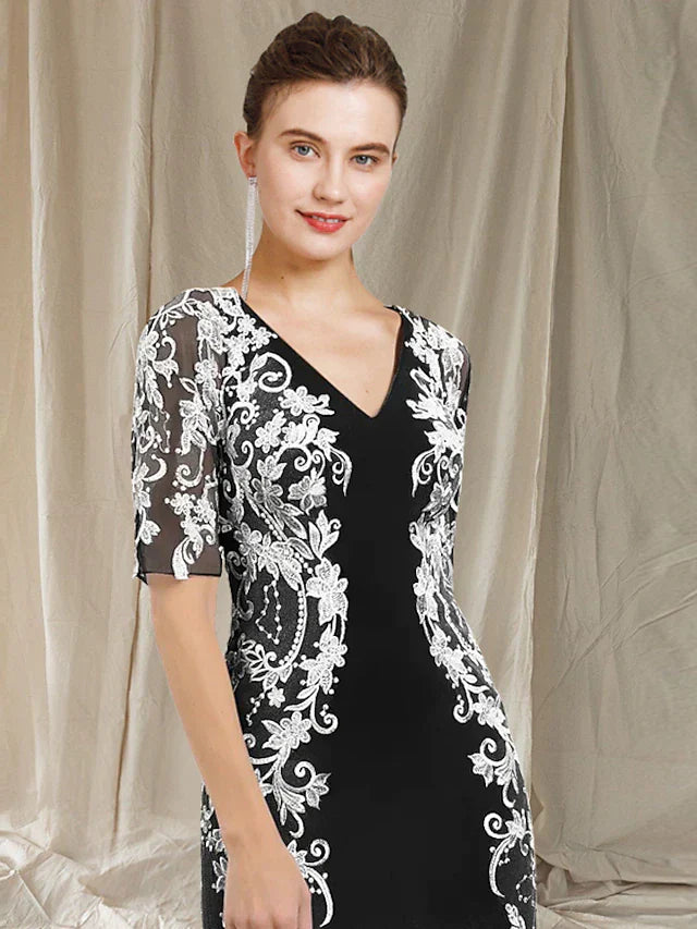 Sheath / Column Mother of the Bride Dress Elegant V Neck Floor Length Chiffon Lace Half Sleeve with Appliques
