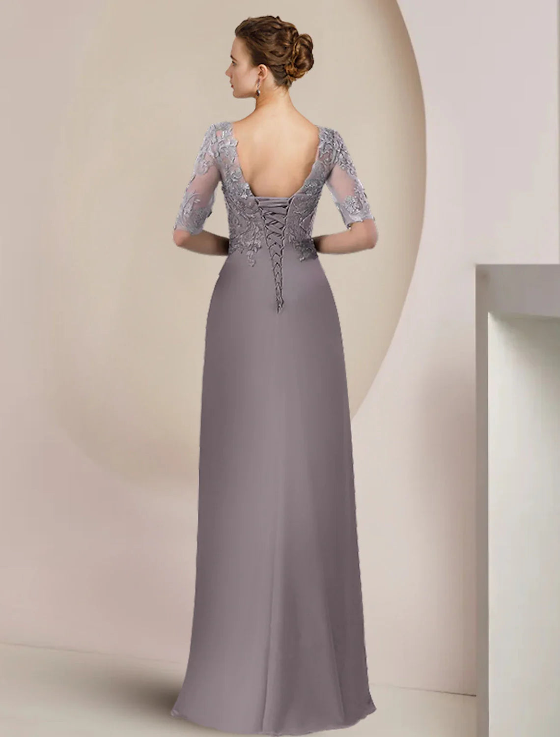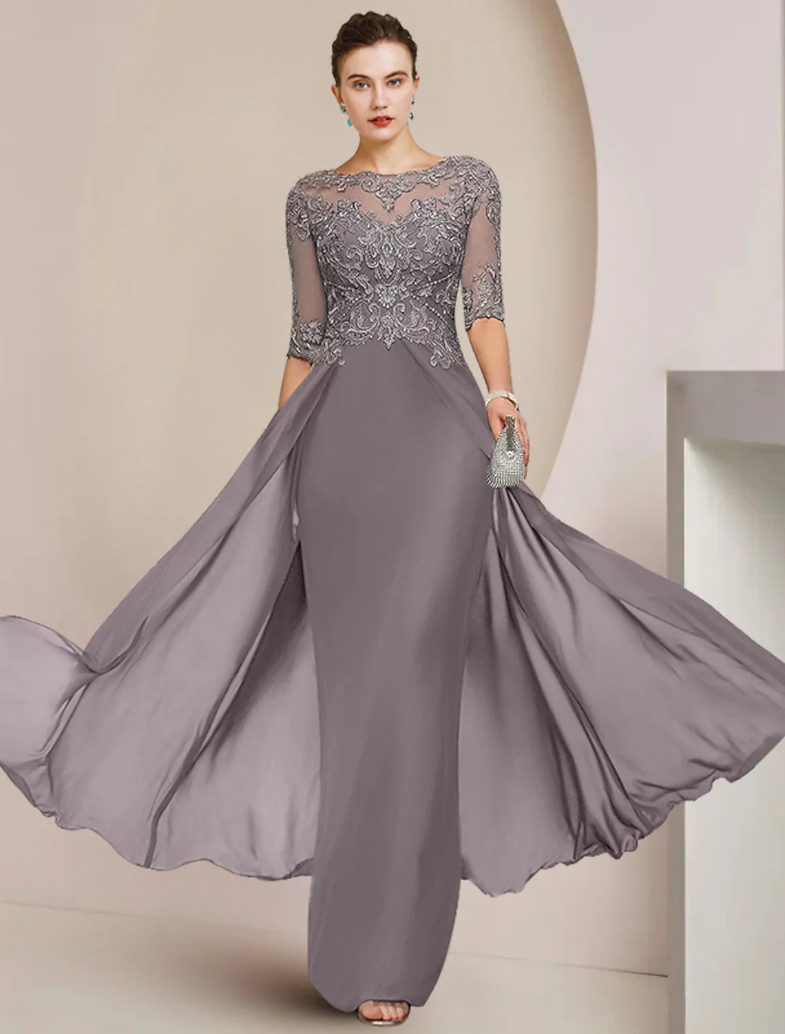 Sheath / Column Mother of the Bride Dress Formal Wedding Guest Elegant Scoop Neck Floor Length Chiffon Lace Half Sleeve with Beading Appliques