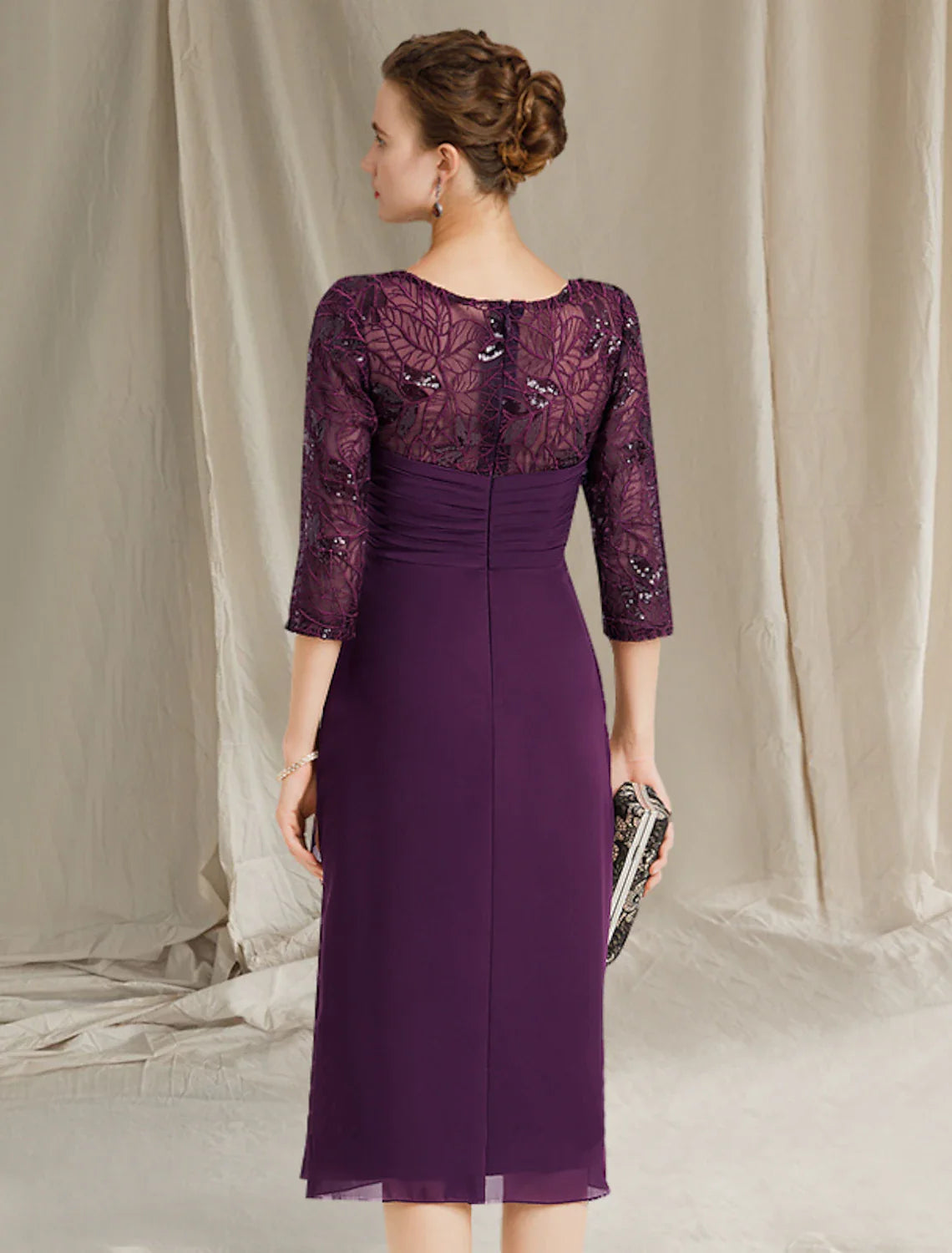 Sheath / Column Mother of the Bride Dress Plus Size Elegant Jewel Neck Knee Length Stretch Chiffon Short Sleeve with Sequin Side-Draped