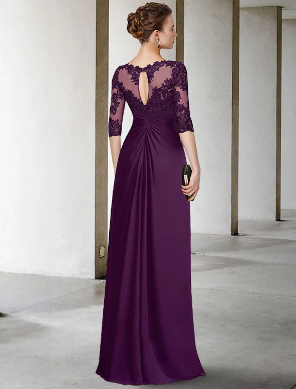 Sheath / Column Mother of the Bride Dress Plus Size Elegant Jewel Neck V Neck Floor Length Chiffon Lace Half Sleeve with Ruched Appliques