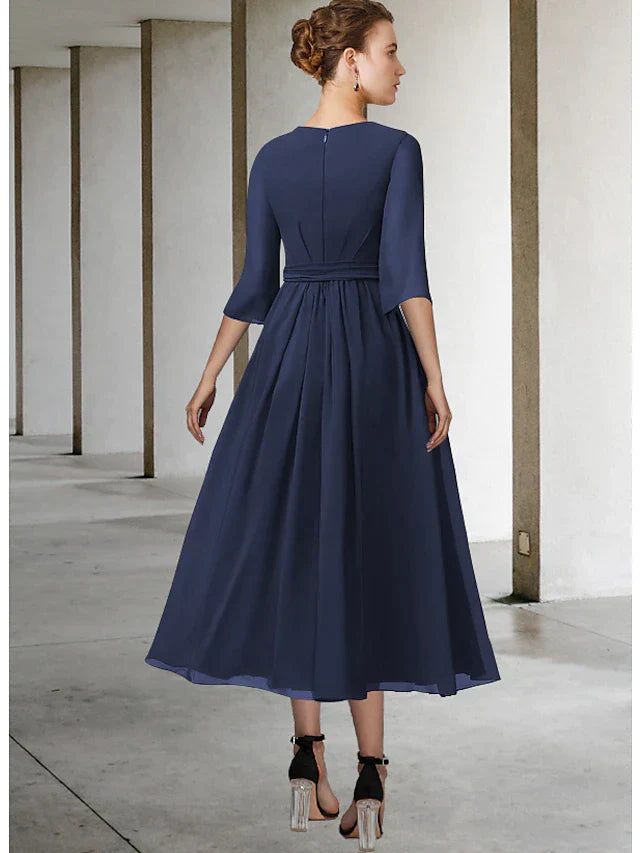 Sheath / Column Mother of the Bride Dress Simple Elegant Scoop Neck Tea Length Chiffon Half Sleeve with Sash / Ribbon Pleats