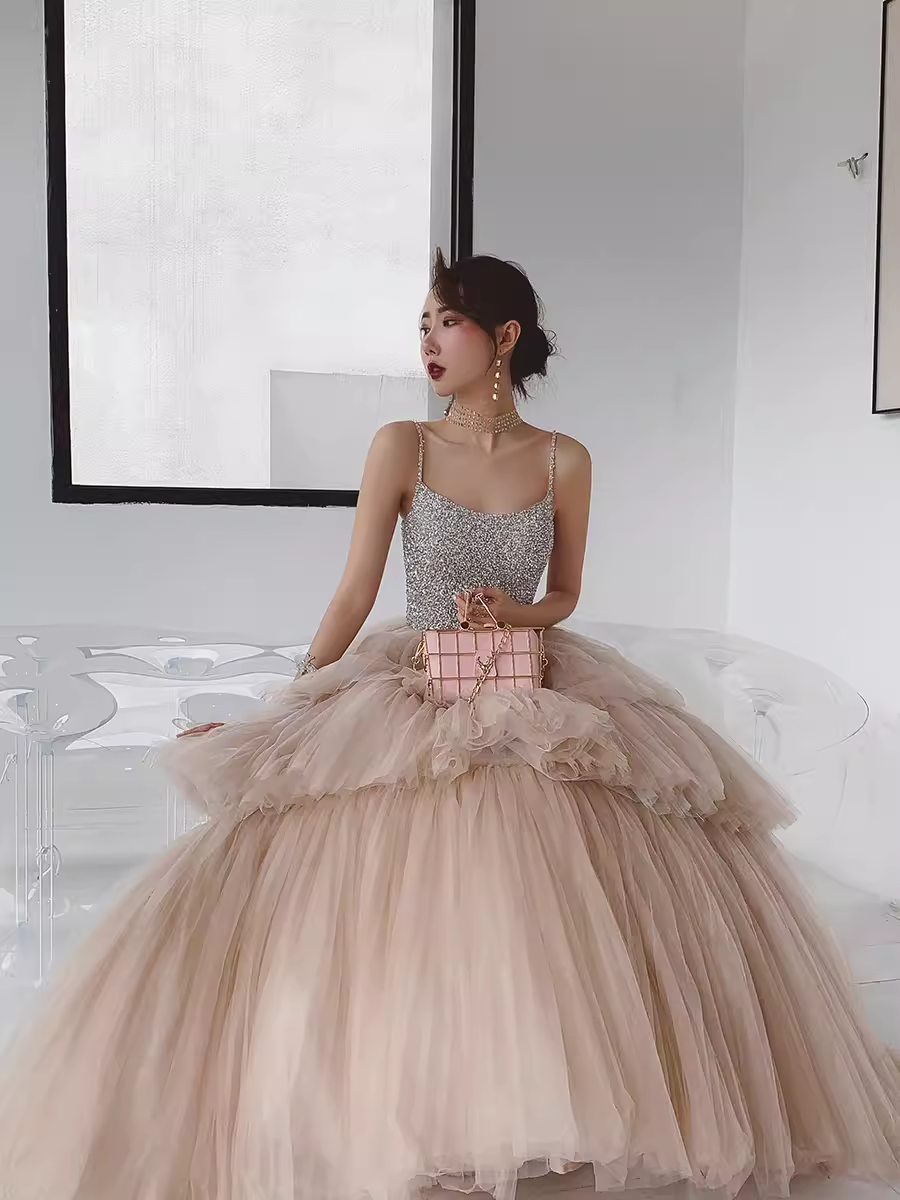 Simple Ball Gown Champagne Tulle Prom Dresses Evening Dress P2151