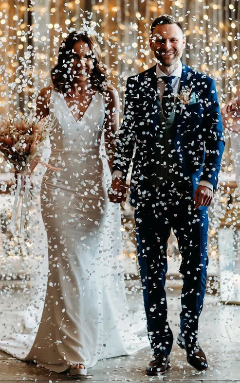 Simple Casual Trumpet V-neck Sleeveless Wedding Dress for Women Floor-length with V Back Long Train Elegant