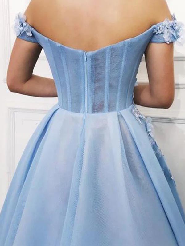 Sky Blue Off the Shoulder Flower Appliques Long Beautiful Prom Dress, OL653