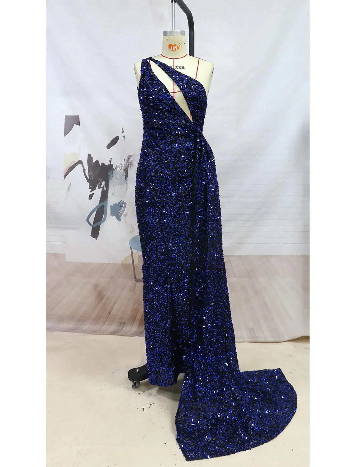 Sparkle Shine High Split Prom Formal Evening Dress One Shoulder Sleeveless Sequined with Slit