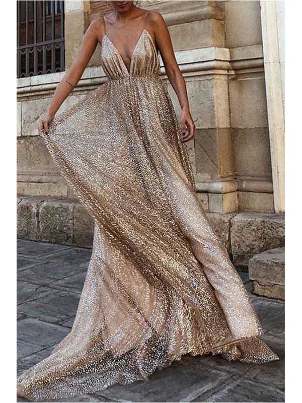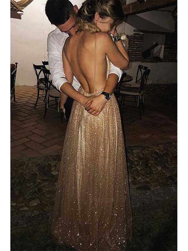 Sparkly Champagne Deep V-neck Tulle Long Prom Dress, OL683
