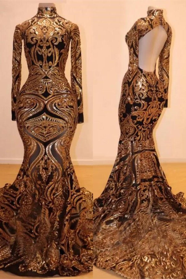 Sparkly Gold High Neck Long Sleeve Mermaid Prom Dress