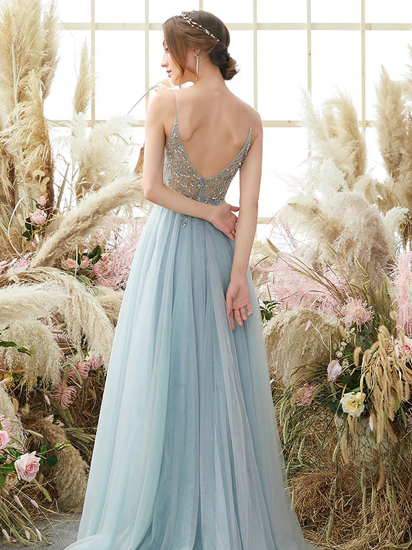Sparkly Spaghetti Straps V-neck Side Slit Tulle Prom Dress, OL556