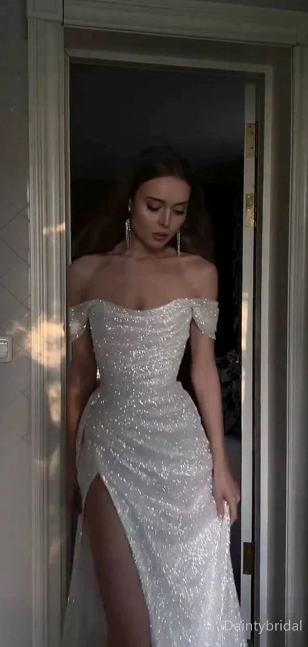 Sparkly White Off the Shoulder A-line Long Prom Dresses Evening Dress with Side Slit, OL962