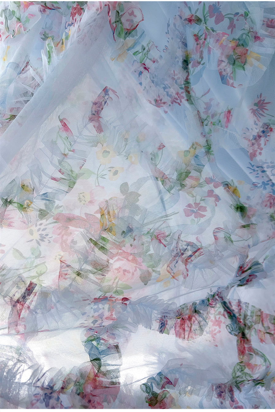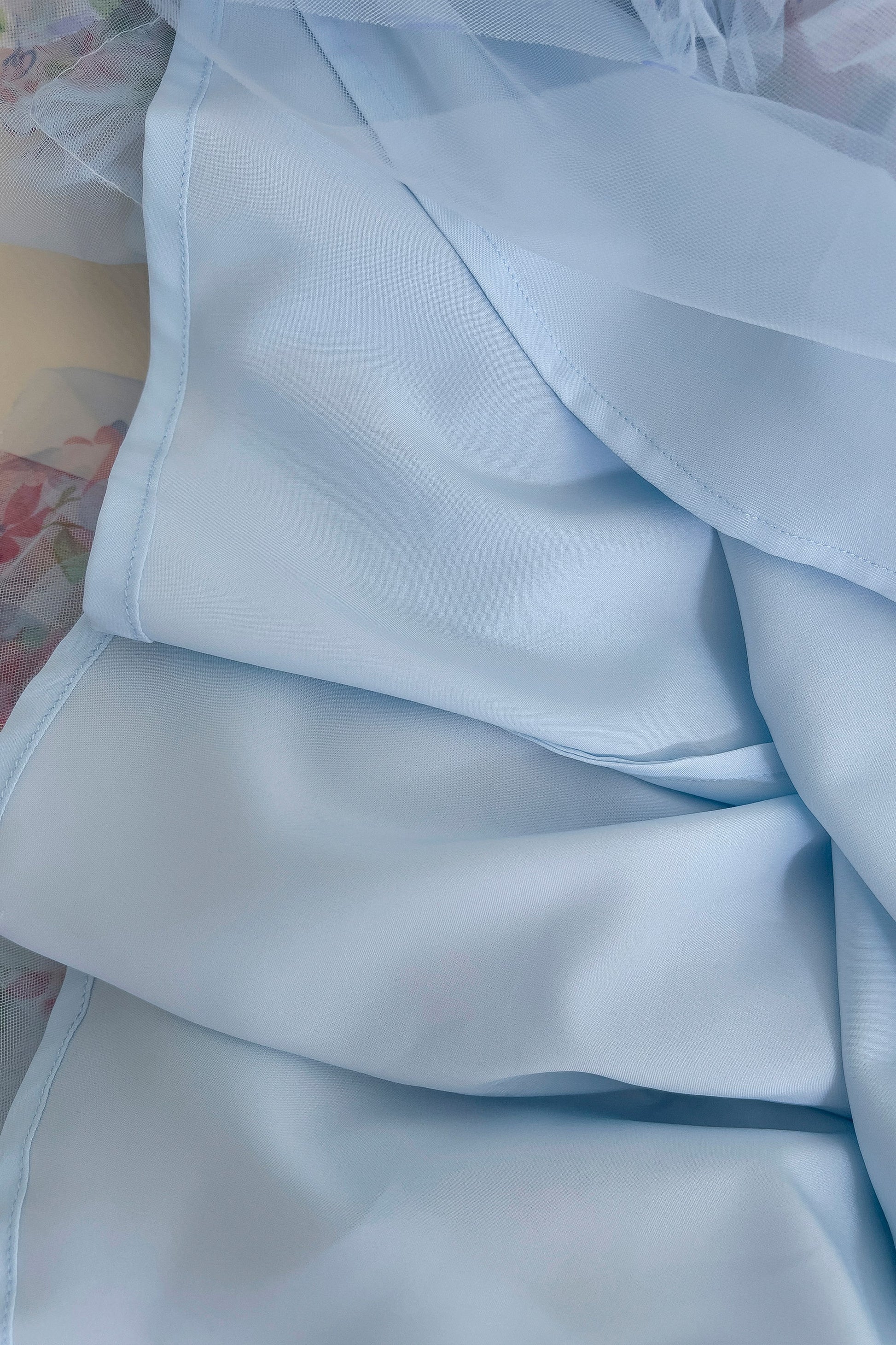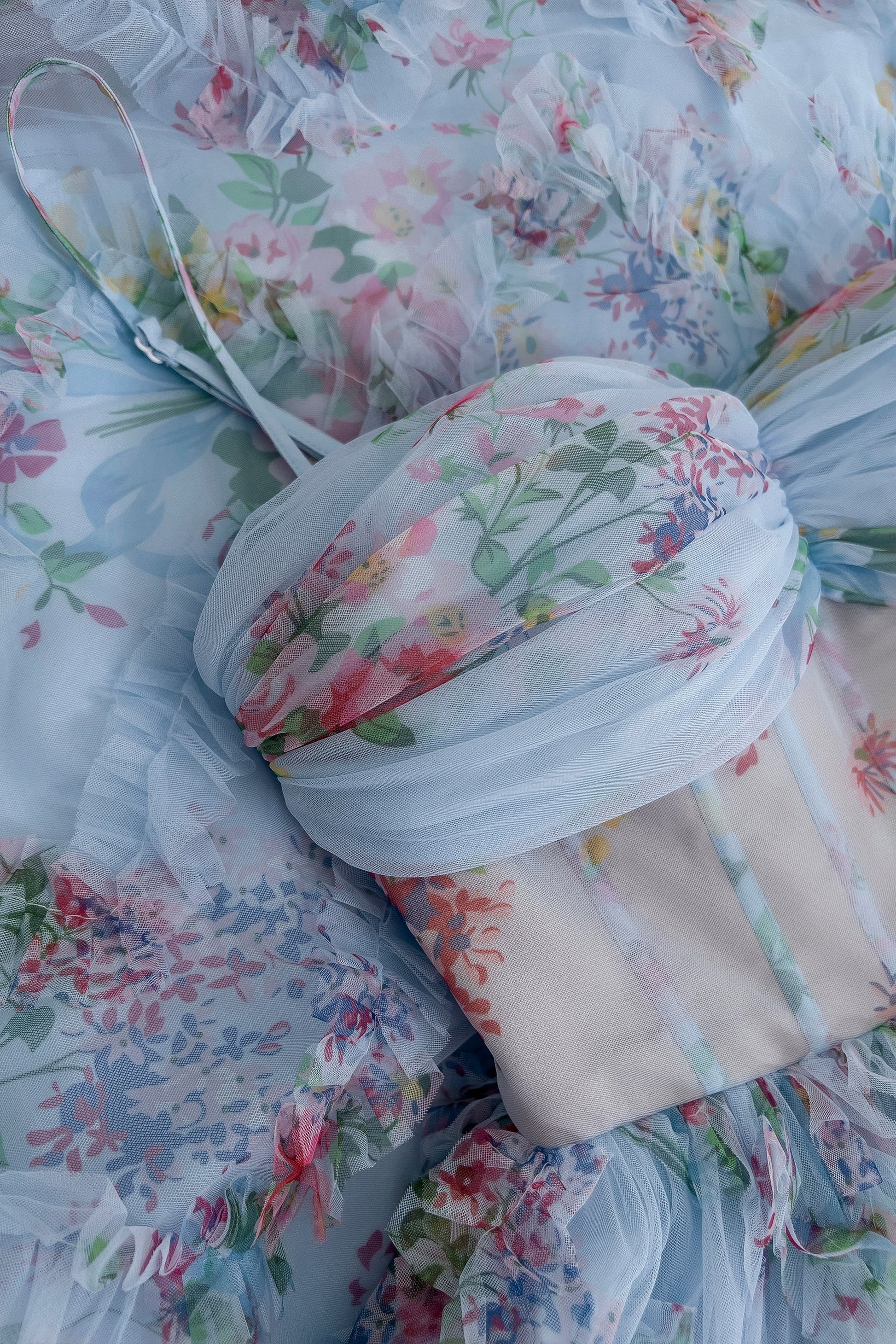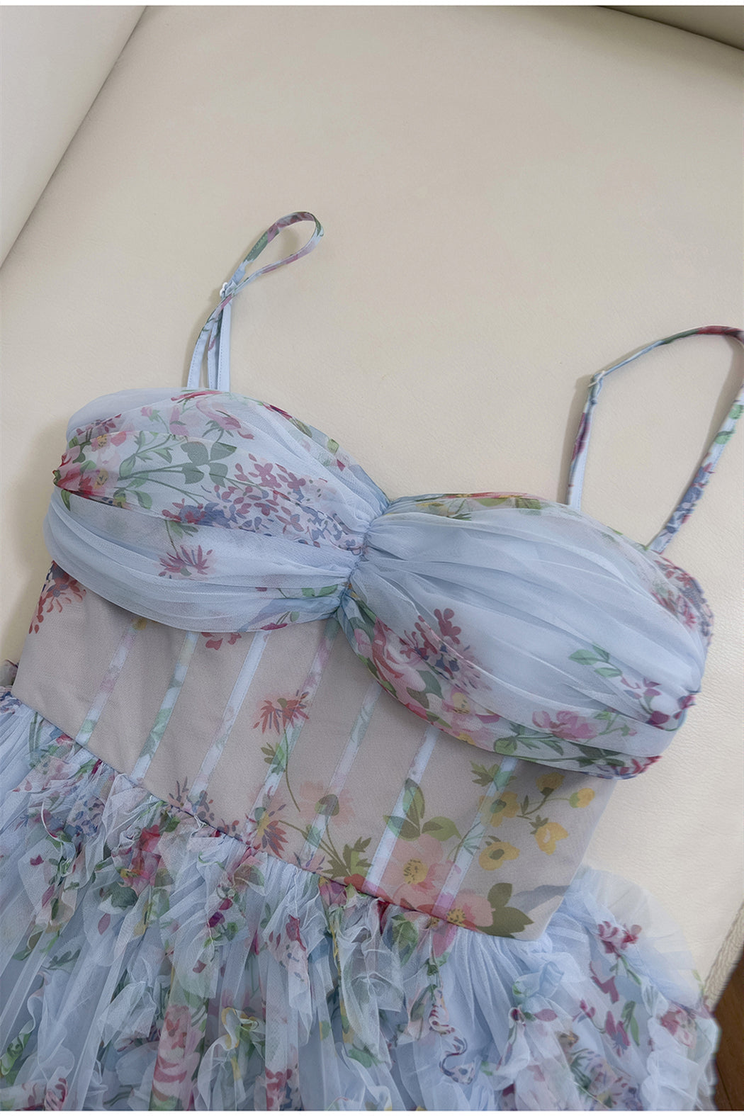 Pretty Straps Blue Floral Print Ruched Long Formal Evening Dresses