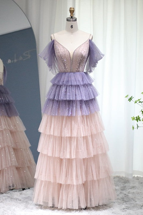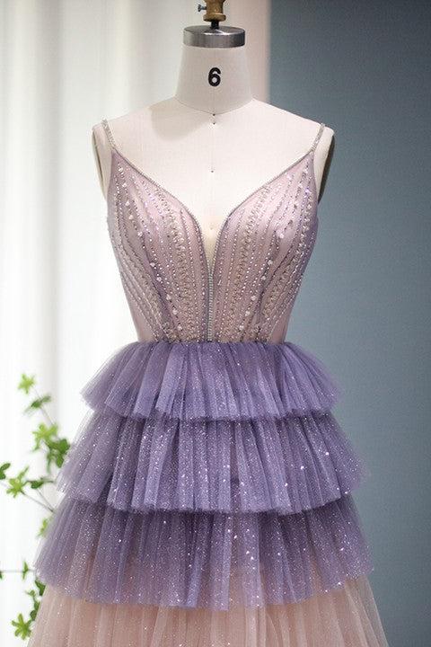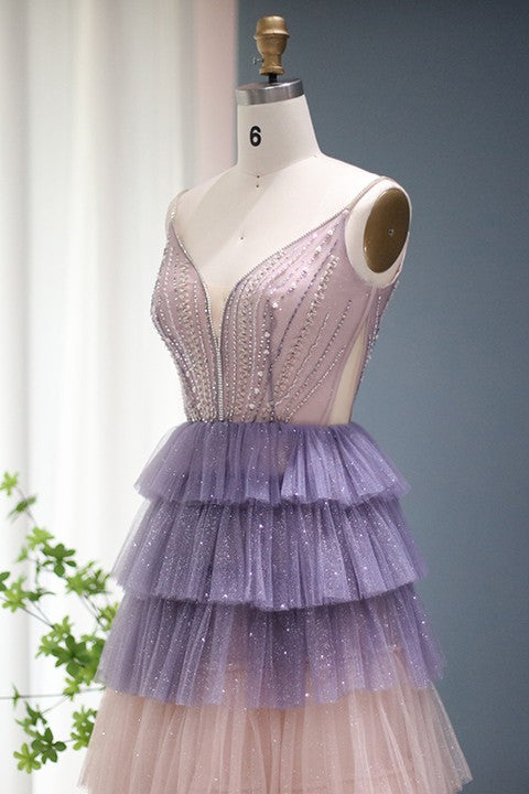 Stunning V Neck Evening Dress with Sequin Beading and Layered Hem