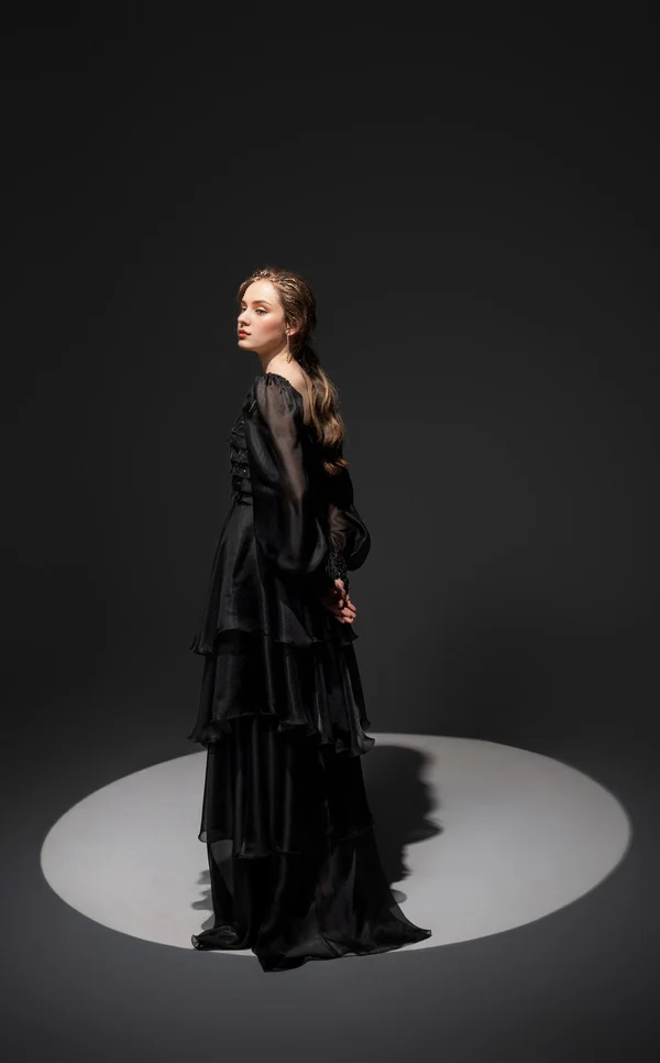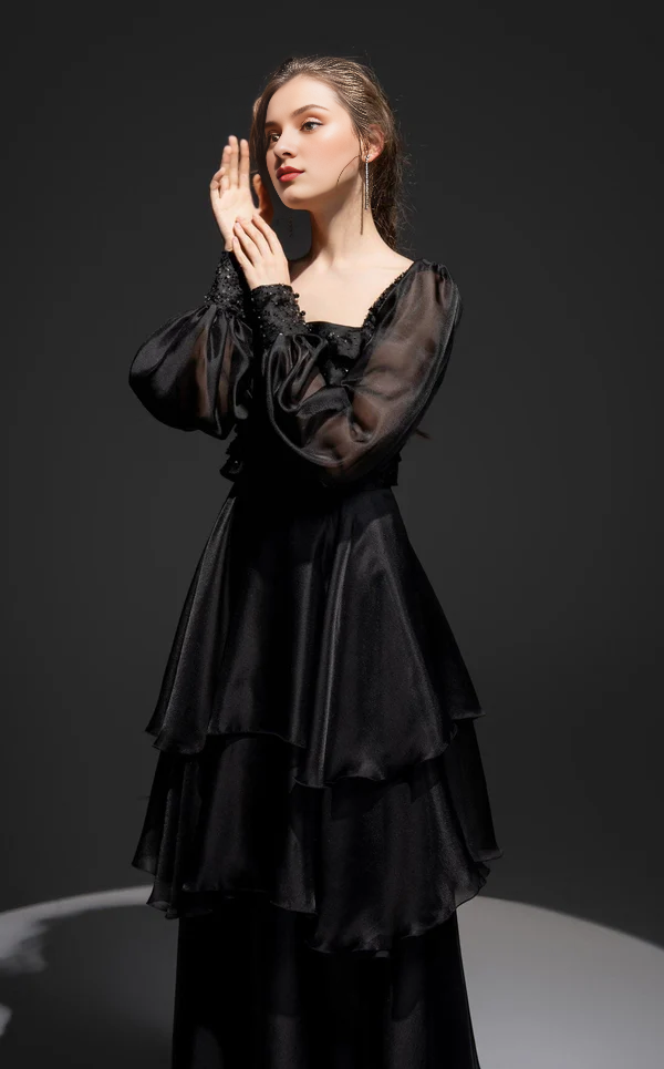 Tight fitting top paired with thin shoulder straps Prom ress