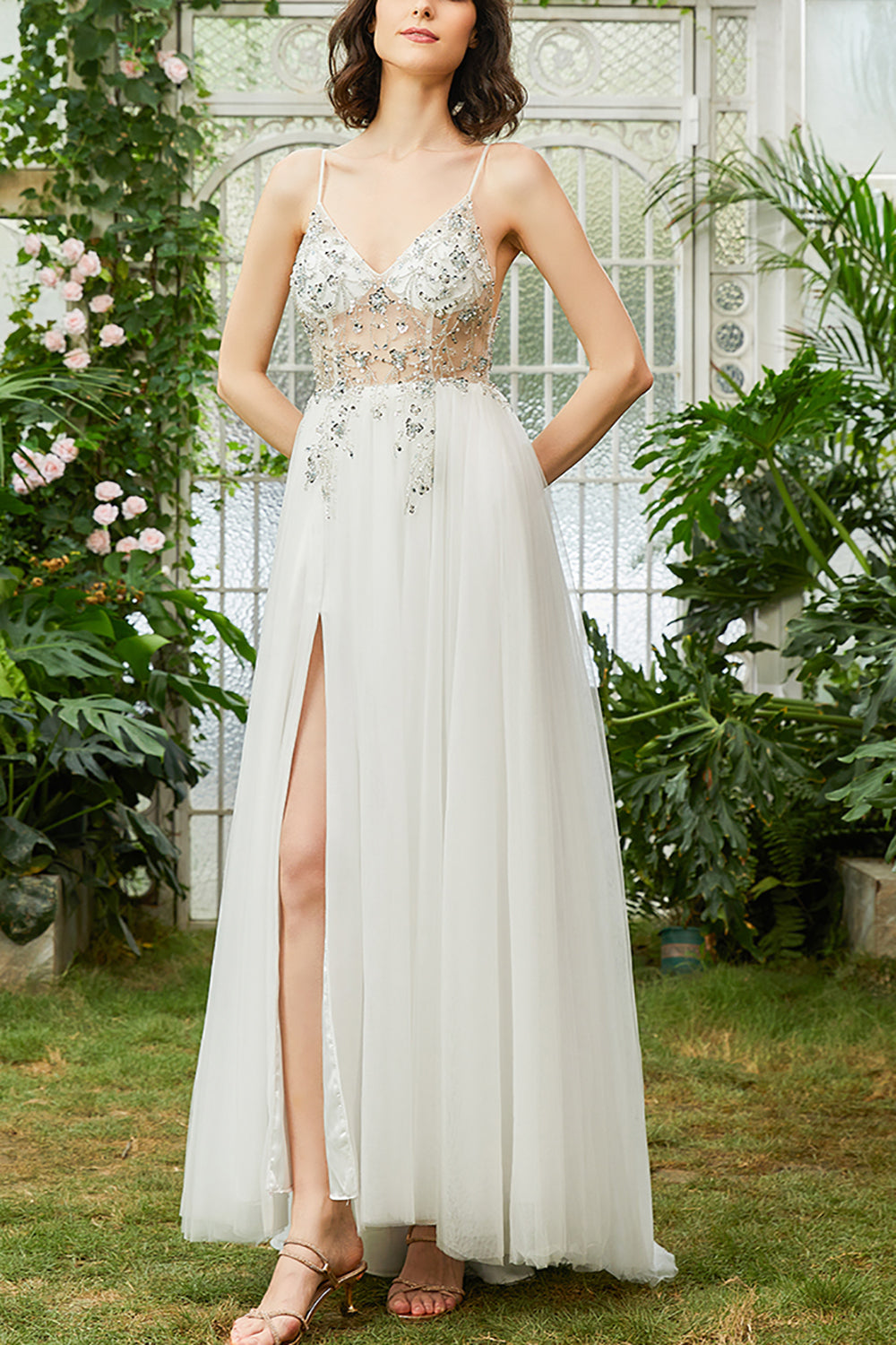 Tulle Spaghetti Straps White Long Prom Dress with Beading Sexy