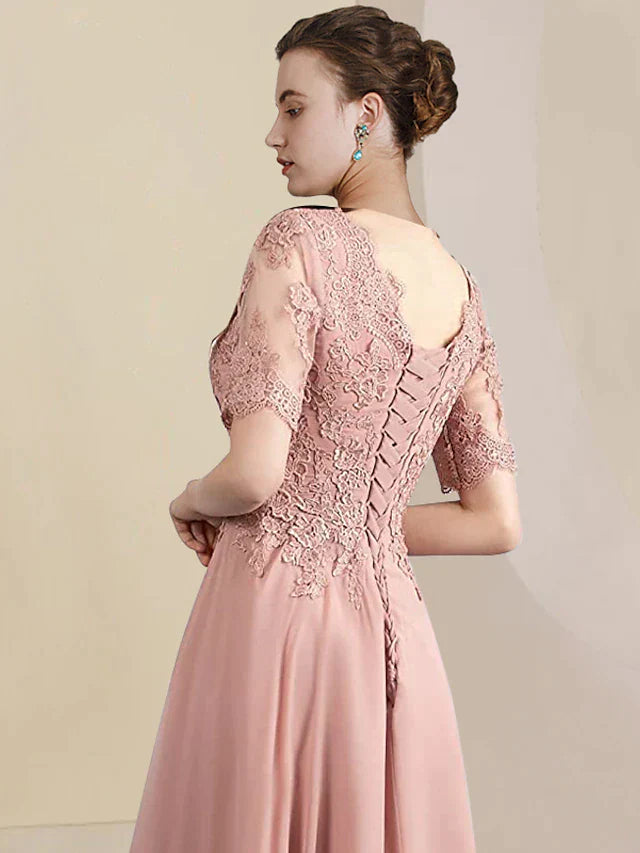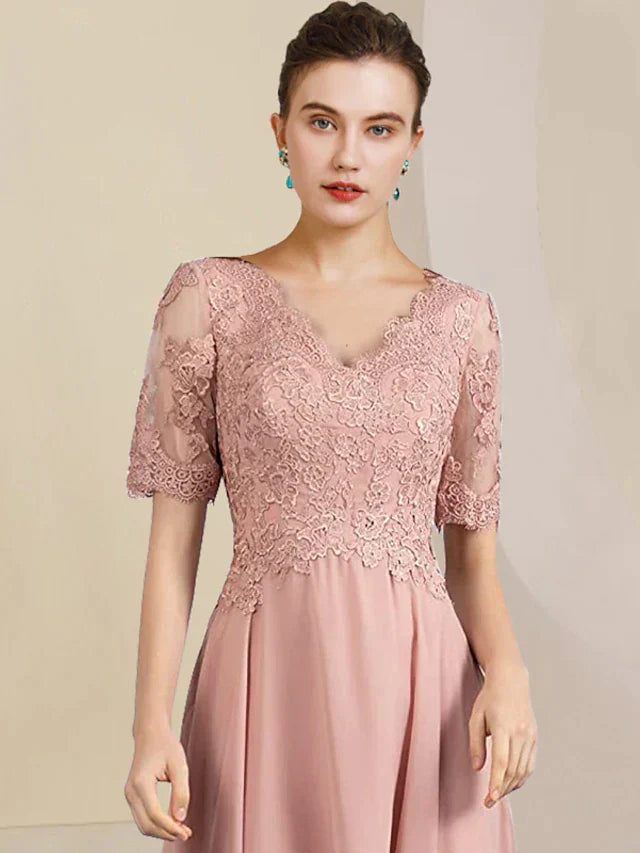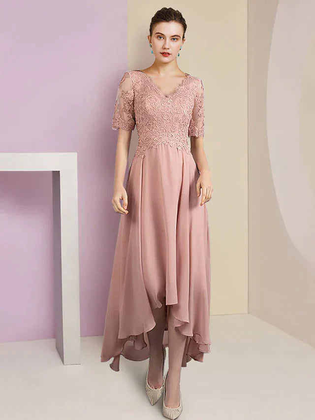 Two Piece A-Line Mother of the Bride Dress Formal Wedding Guest Elegant High Low V Neck Asymmetrical Tea Length Chiffon Lace Short Sleeve Wrap Included with Pleats Appliques