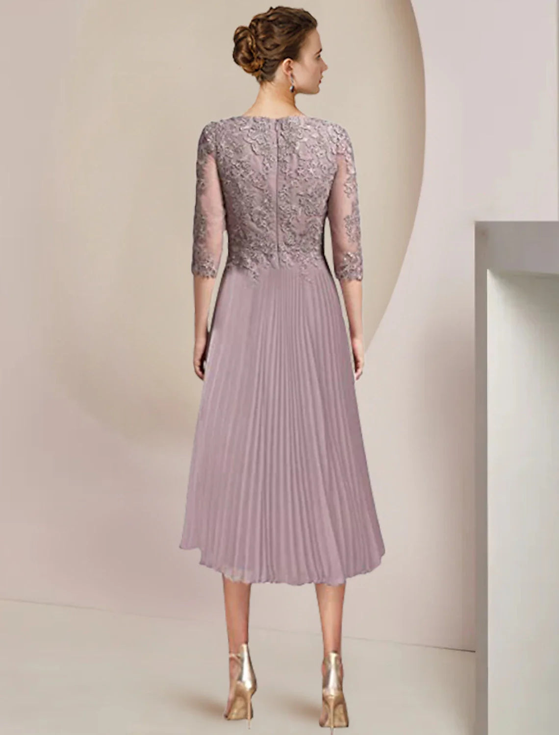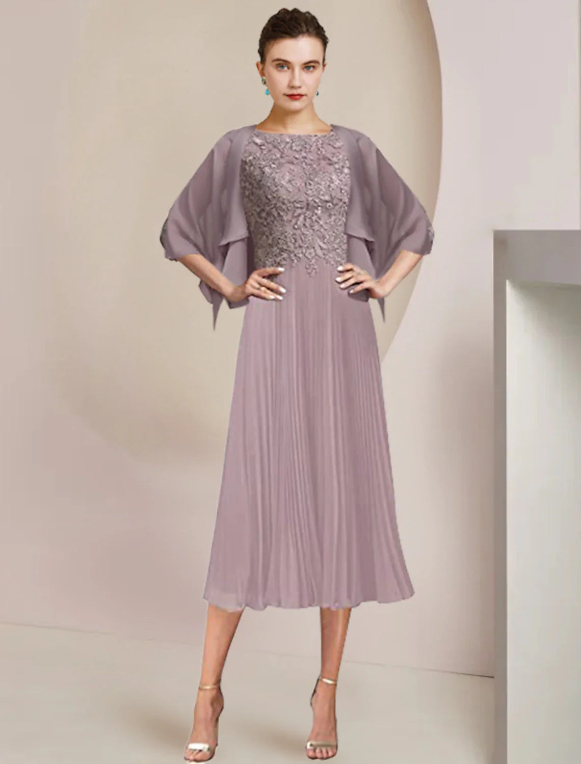 Two Piece A-Line Mother of the Bride Dress Formal Wedding Guest Elegant Scoop Neck Tea Length Lace 3/4 Length Sleeve Wrap Included with Pleats Appliques
