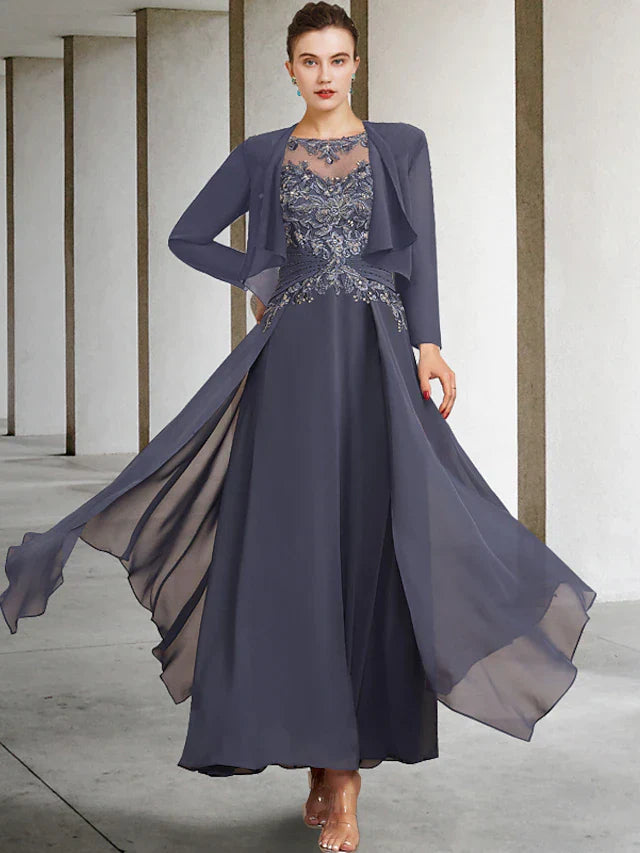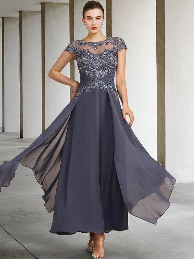Two Piece A-Line Plus Size Curve Mother of the Bride Dress Elegant Jewel Neck Ankle Length Chiffon Lace Short Sleeve Wrap Included with Ruched Appliques