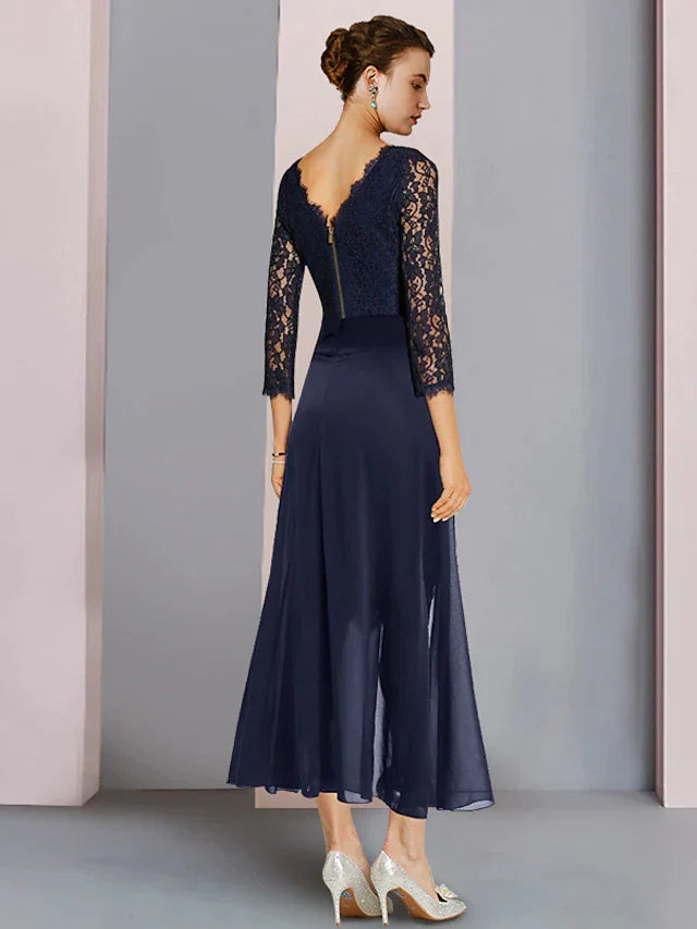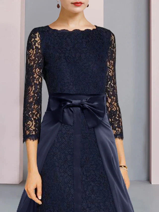 Two Piece Sheath / Column Mother of the Bride Dress Formal Wedding Guest Elegant Scoop Neck Knee Length Chiffon Lace 3/4 Length Sleeve with Bow(s)