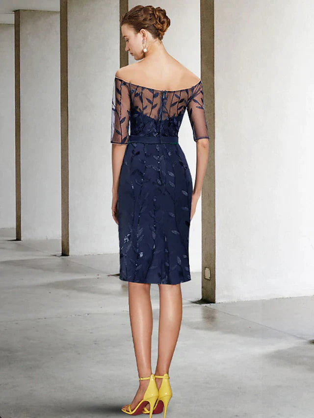 Two Piece Sheath / Column Mother of the Bride Dress Formal Wedding Guest Sparkle & Shine Elegant Off Shoulder Knee Length Chiffon Lace Sequined Half Sleeve with Bow(s) Appliques