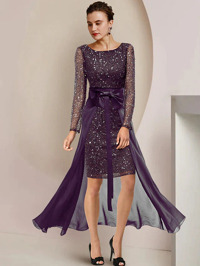 Two Piece Sheath / Column Mother of the Bride Dress Formal Wedding Guest Sparkle & Shine Elegant Scoop Neck Knee Length Lace Sequined Long Sleeve with Beading Sequin