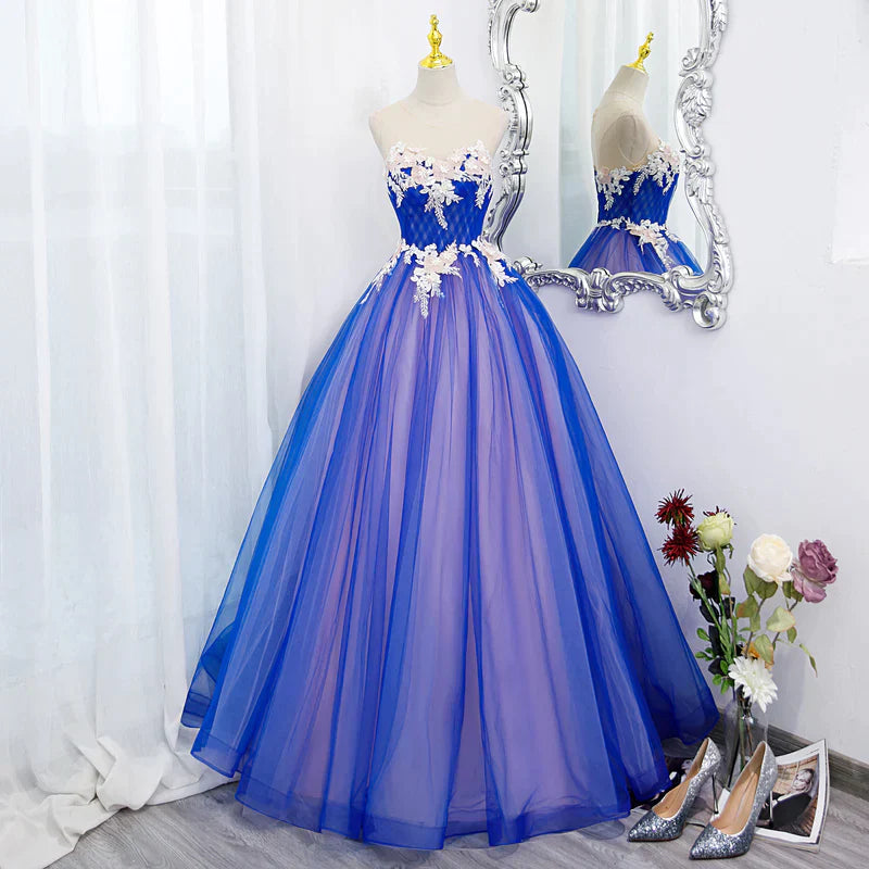 Unique Blue and Pink Formal Gown with Lace, Sweetheart Blue Floor Length Prom Dress