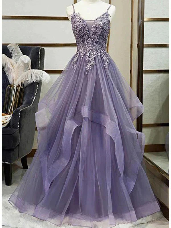 Unique Long Tulle Spaghetti Straps Prom Dress Evening Dress with Lace Applique, OL594