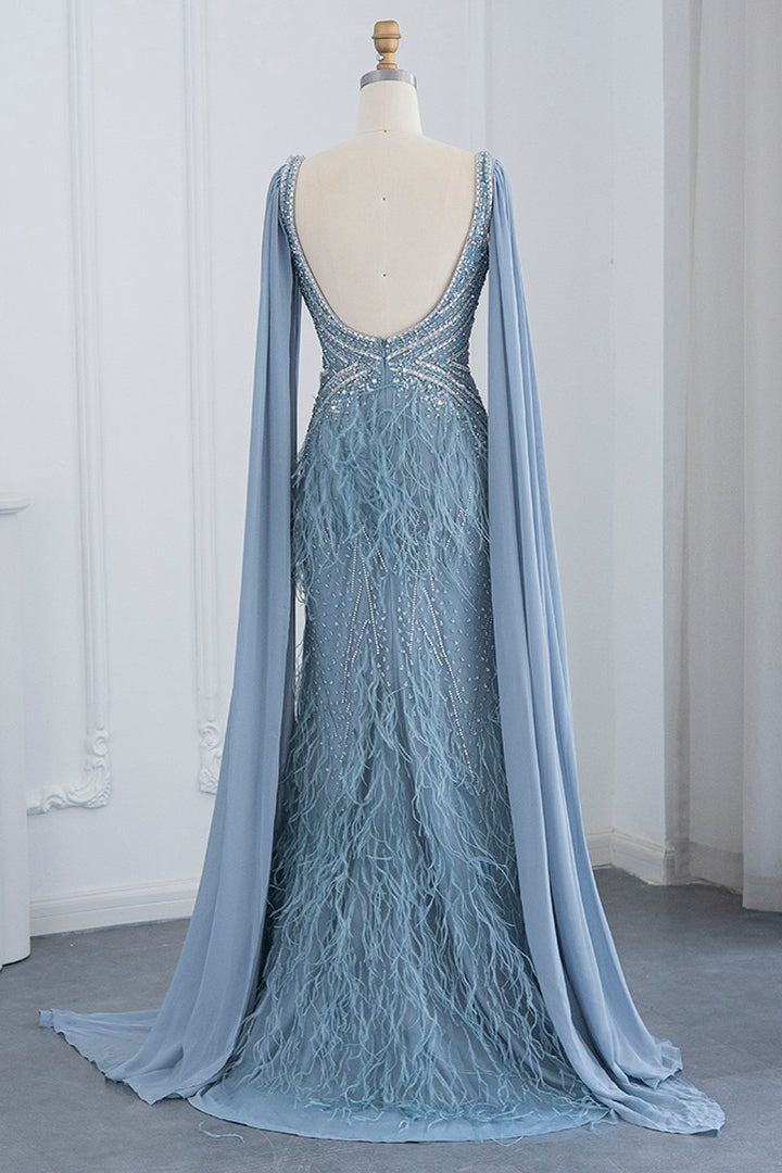 V Neck Feather-Accented Evening Dress with Mermaid Side Split and Open Back